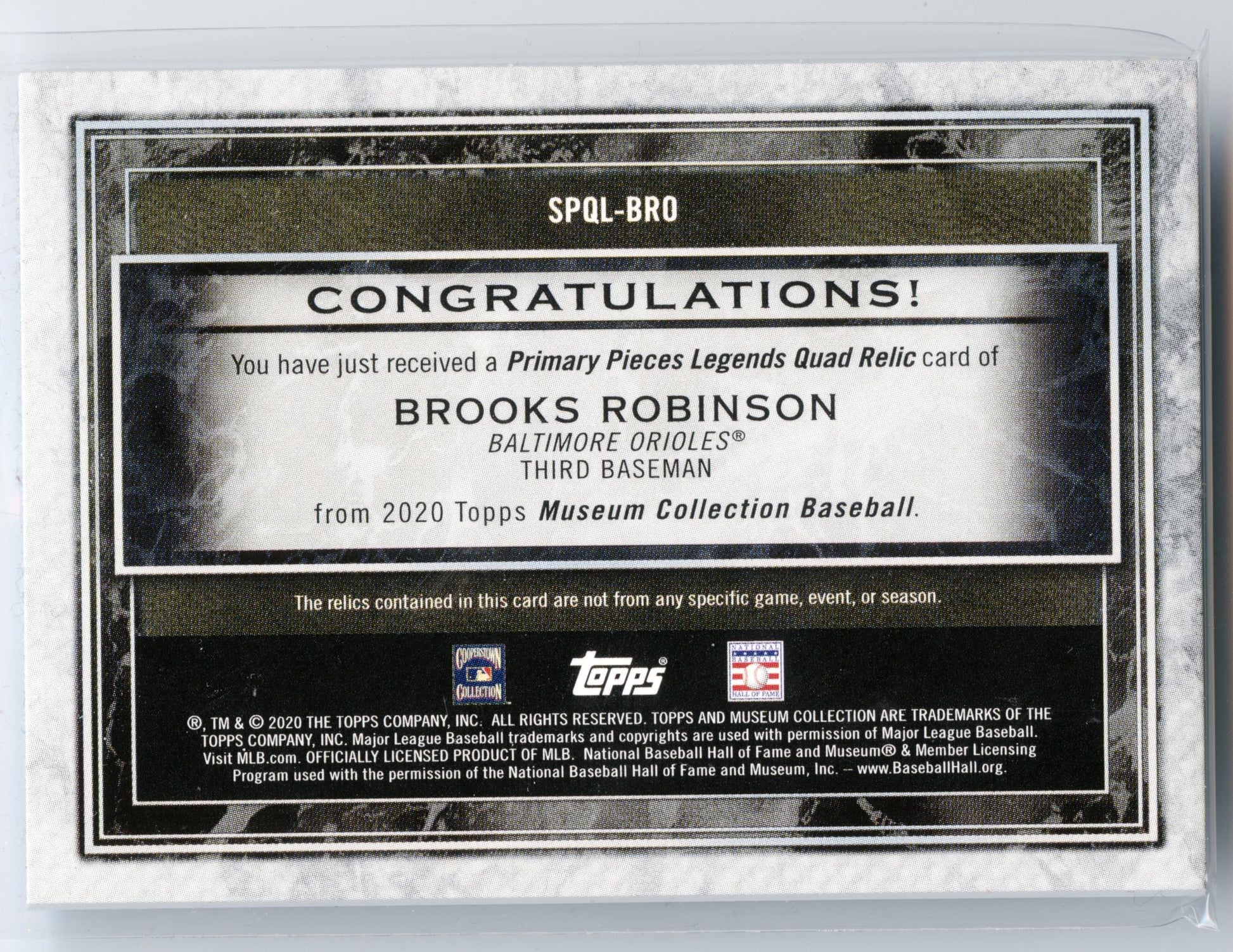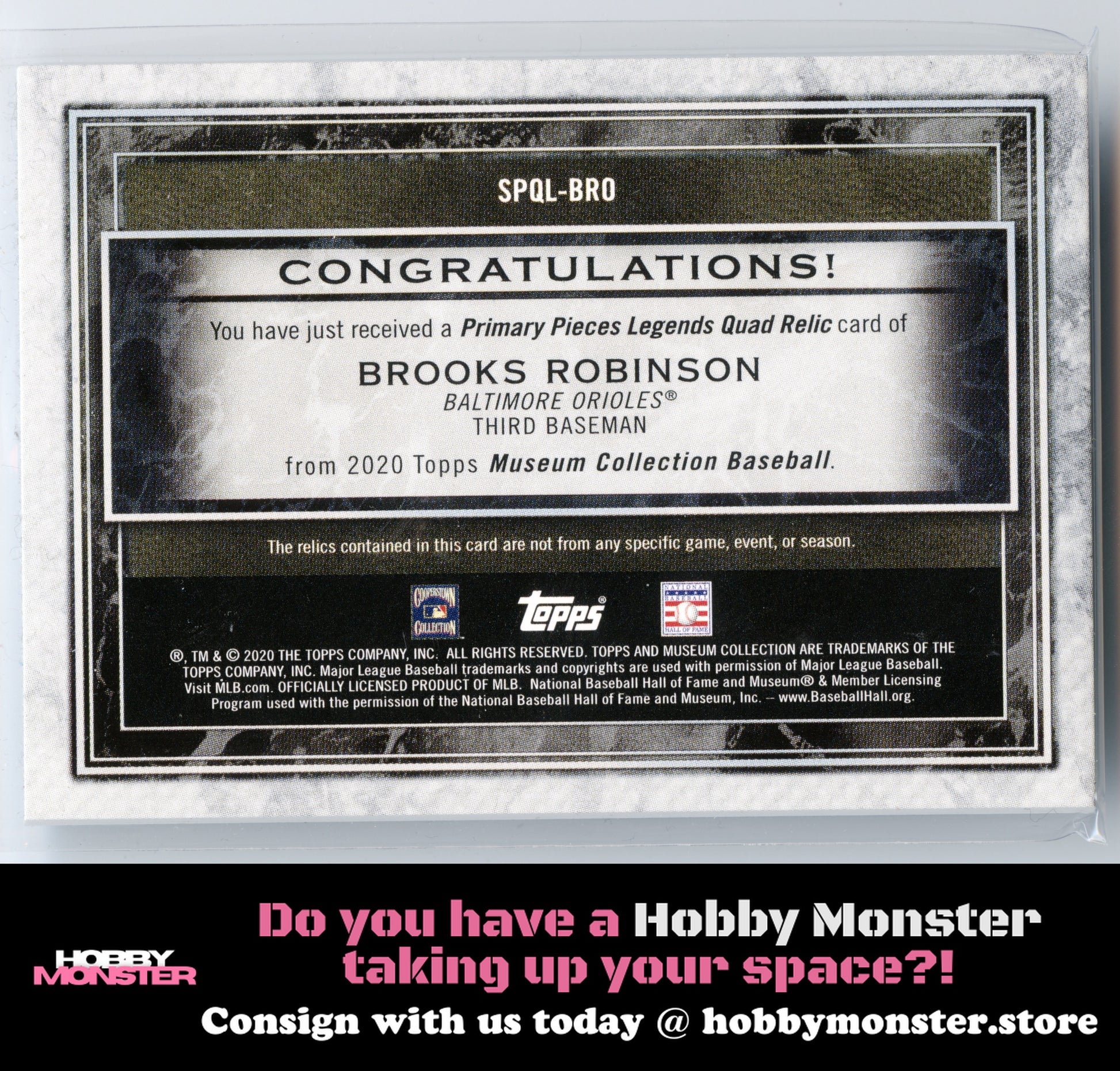 Consign with us today at hobbymonster.storeThank you for your interest in this item! This card is being consigned with Hobby Monster!2020 Topps Museum Collection Single-Player Primary Pieces Quad Relic Legends Brooks Robinson Item Condition/Details - Please ReadPlease use photos provided for your own assessment of condition and centering. We cannot accommodate requests for additional pictures. Cards can have any number of issues that do not detract from the overall look of the image on the card. These issues can include scratches/surface wear and flaws on edges and corners.PLEASE NOTE THAT SOME TOP LOADERS, CASES, AND GRADED CARD HOLDERS MAY BE SCRATCHED AND DOES NOT REFLECT THE ACTUAL CONDITION OF THE CARD INSIDE. IN ADDITION CARDS THAT ARE SCANNED MAY HAVE LINES RUNNING FROM TOP TO BOTTOM. THESE LINES ARE NOT ON THE ACTUAL CARD OR TOP LOADER.Please click the tab above titled "Shipping, returns, and payments" for more information on shipping.Unpaid items are automatical