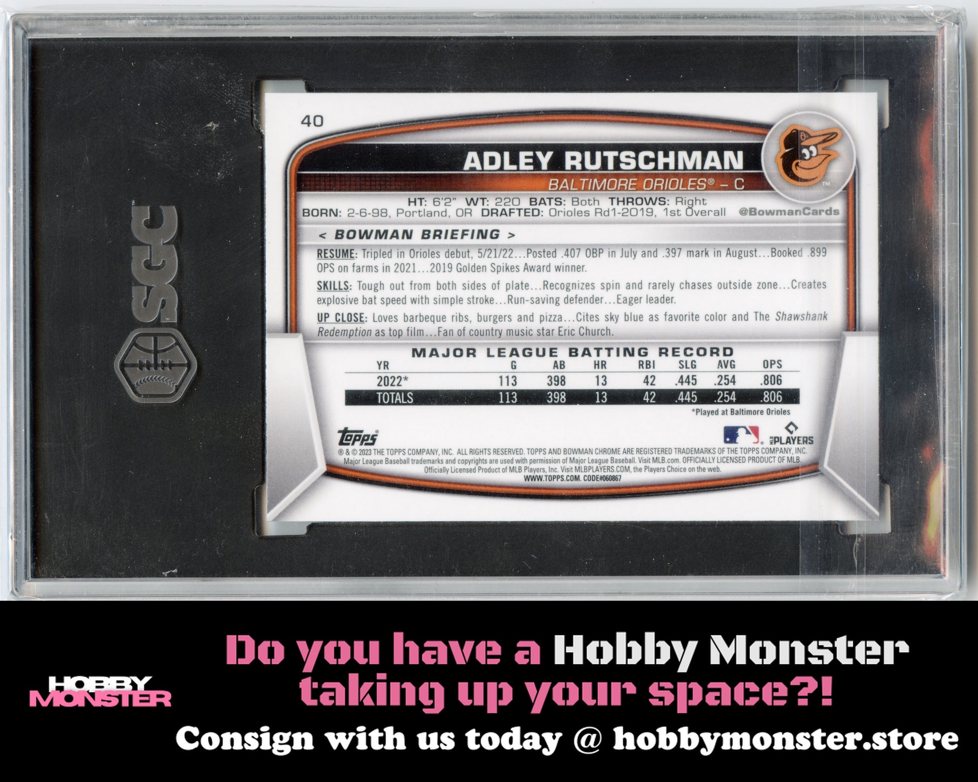 Consign with us today at hobbymonster.storeThank you for your interest in this item! This card is being consigned with Hobby Monster!2023 Bowman Mojo Refractors Adley Rutschman Rookie SGC 10Item Condition/Details - Please ReadPlease use photos provided for your own assessment of condition and centering. We cannot accommodate requests for additional pictures. Cards can have any number of issues that do not detract from the overall look of the image on the card. These issues can include scratches/surface wear and flaws on edges and corners.PLEASE NOTE THAT SOME TOP LOADERS, CASES, AND GRADED CARD HOLDERS MAY BE SCRATCHED AND DOES NOT REFLECT THE ACTUAL CONDITION OF THE CARD INSIDE. IN ADDITION CARDS THAT ARE SCANNED MAY HAVE LINES RUNNING FROM TOP TO BOTTOM. THESE LINES ARE NOT ON THE ACTUAL CARD OR TOP LOADER.Please click the tab above titled "Shipping, returns, and payments" for more information on shipping.Unpaid items are automatically canceled 7 days after the auction
