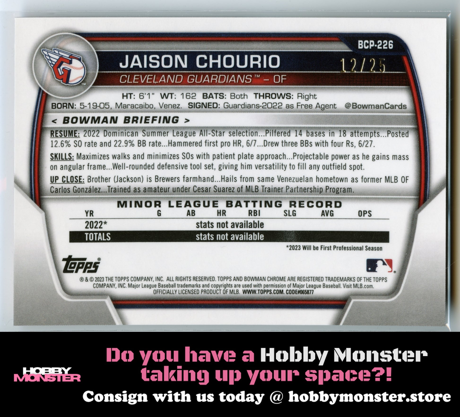 Consign with us today at hobbymonster.storeThank you for your interest in this item! This card is being consigned with Hobby Monster!2023 Bowman Chrome Prospects Orange Shimmer Refractor Jaison Chourio Item Condition/Details - Please ReadPlease use photos provided for your own assessment of condition and centering. We cannot accommodate requests for additional pictures. Cards can have any number of issues that do not detract from the overall look of the image on the card. These issues can include scratches/surface wear and flaws on edges and corners.PLEASE NOTE THAT SOME TOP LOADERS, CASES, AND GRADED CARD HOLDERS MAY BE SCRATCHED AND DOES NOT REFLECT THE ACTUAL CONDITION OF THE CARD INSIDE. IN ADDITION CARDS THAT ARE SCANNED MAY HAVE LINES RUNNING FROM TOP TO BOTTOM. THESE LINES ARE NOT ON THE ACTUAL CARD OR TOP LOADER.Please click the tab above titled "Shipping, returns, and payments" for more information on shipping.Unpaid items are automatically canceled 7 days after