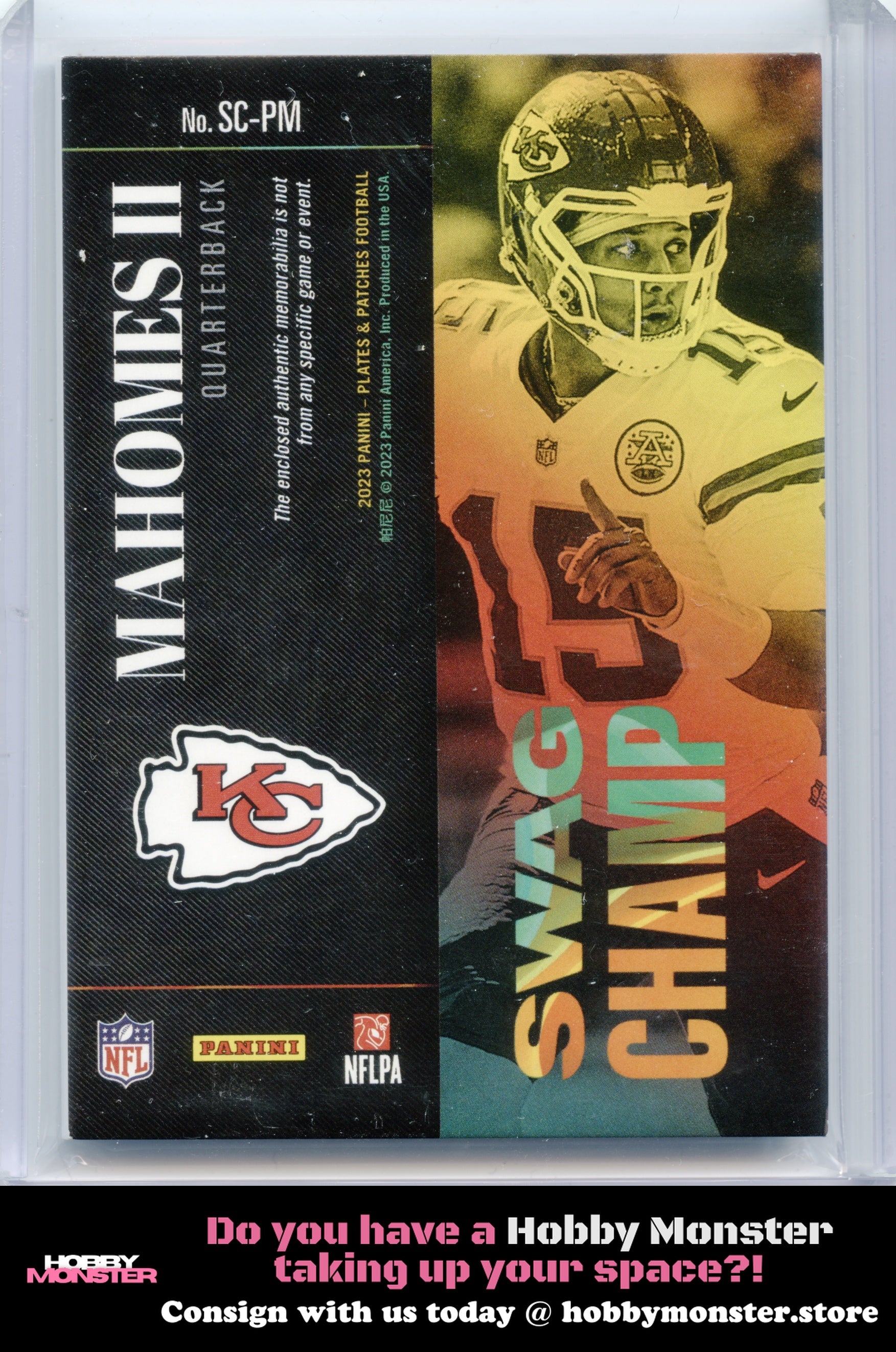 Consign with us today at hobbymonster.storeThank you for your interest in this item! This card is being consigned with Hobby Monster!2023 Panini Plates & Patches Swag Champ Blue Patrick Mahomes II Item Condition/Details - Please ReadPlease use photos provided for your own assessment of condition and centering. We cannot accommodate requests for additional pictures. Cards can have any number of issues that do not detract from the overall look of the image on the card. These issues can include scratches/surface wear and flaws on edges and corners.PLEASE NOTE THAT SOME TOP LOADERS, CASES, AND GRADED CARD HOLDERS MAY BE SCRATCHED AND DOES NOT REFLECT THE ACTUAL CONDITION OF THE CARD INSIDE. IN ADDITION CARDS THAT ARE SCANNED MAY HAVE LINES RUNNING FROM TOP TO BOTTOM. THESE LINES ARE NOT ON THE ACTUAL CARD OR TOP LOADER.Please click the tab above titled "Shipping, returns, and payments" for more information on shipping.Unpaid items are automatically canceled 7 days after the